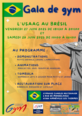 L'Union Sportive l'Avenr Amnéville Gymnastique (USAAG) organise son Gala de fin d'année le vendredi 27 juin 2025 de 18h30 à 20h00 et le samedi 28 juin de 11h00 à 16h00.